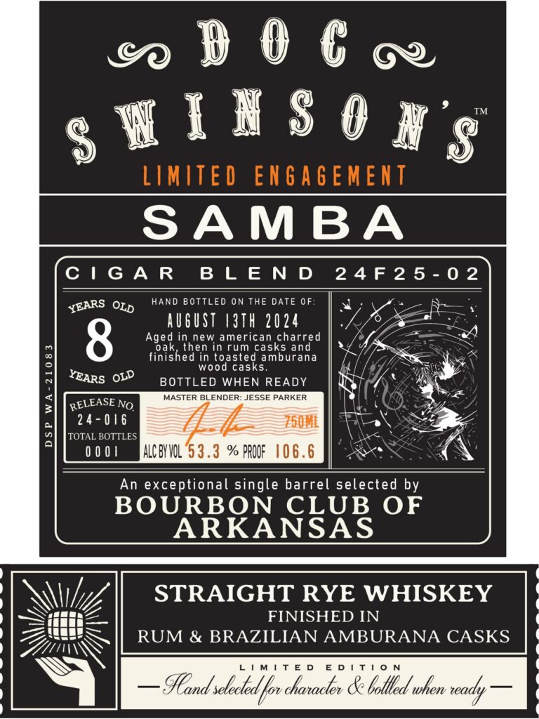 The Bourbon Club of Arkansas (BCA) has unveiled a highly limited and unconventional barrel selection nicknamed “Samba,” a Doc Swinson Amburana Rum Finished Rye Whiskey (Cigar Batch) created exclusively for the club and released through Warehouse Liquor on Main.